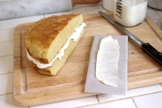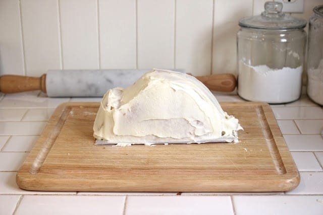- See cream cheese icing recipe below. Make base for the cake to sit on by wrapping a piece of cardboard in parchment paper. You can use wrapping paper, printer paper or foil… whatever you have.